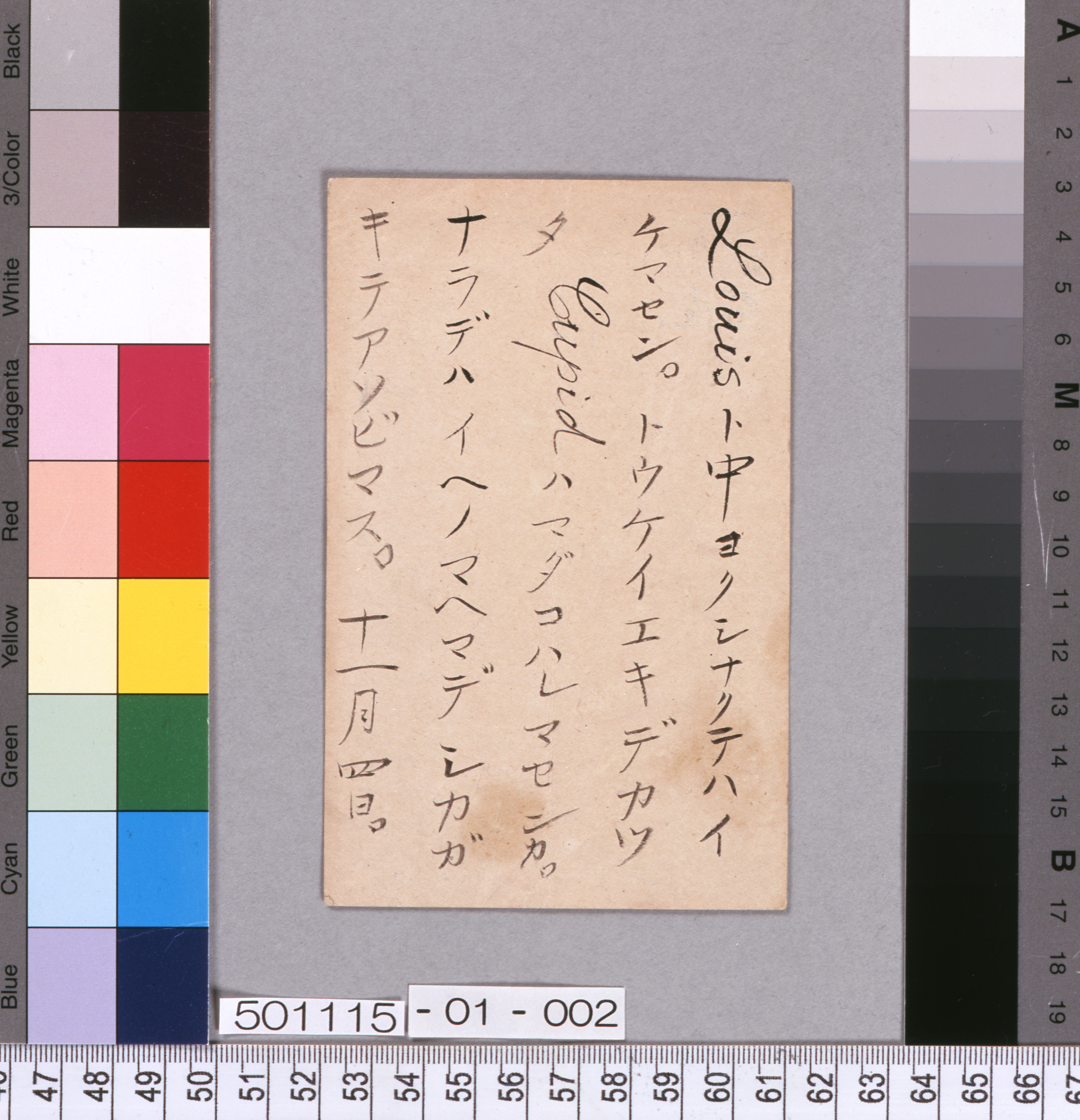 鴎外は、帝室博物館総長として正倉院開封と曝寮に立ち会うべく訪れた奈良で、東京の家族に毎日のように手紙を書いた。次女・杏奴宛てのこの葉書には、「Louisト中ヨク」(Louisは三男・類)などと、子どもを思いやる文言が綴られる。 |