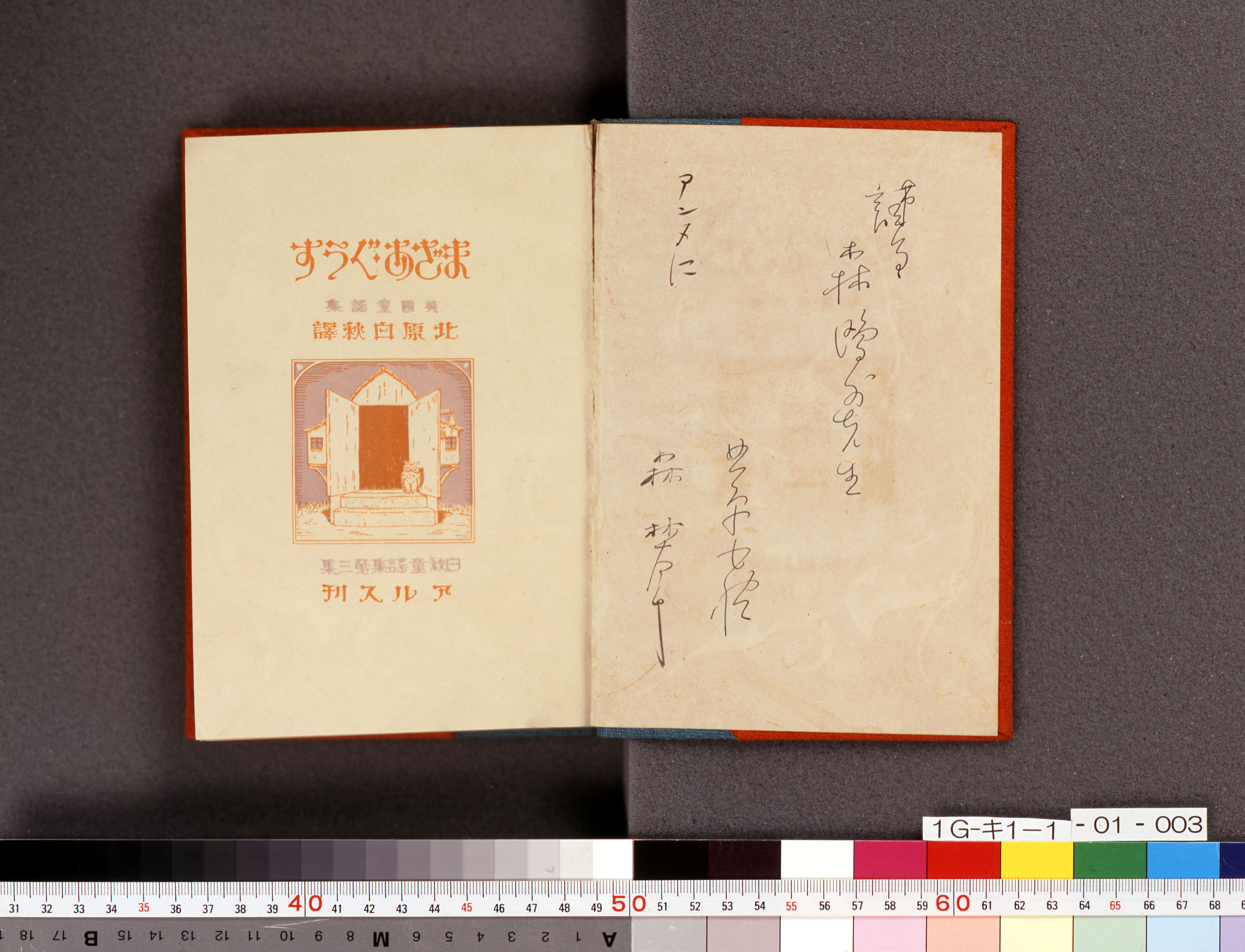 イギリスの伝承童謡集『マザーグース』の訳詩集。北原白秋が翻訳し鈴木三重吉主宰の雑誌「赤い鳥」に連載した後、単行本にまとめた。見返しには、白秋から鴎外あての献辞「謹呈 森鴎外先生」と、鴎外が後に次女・杏奴に贈った時の献辞「アンヌに」が記されている。 |