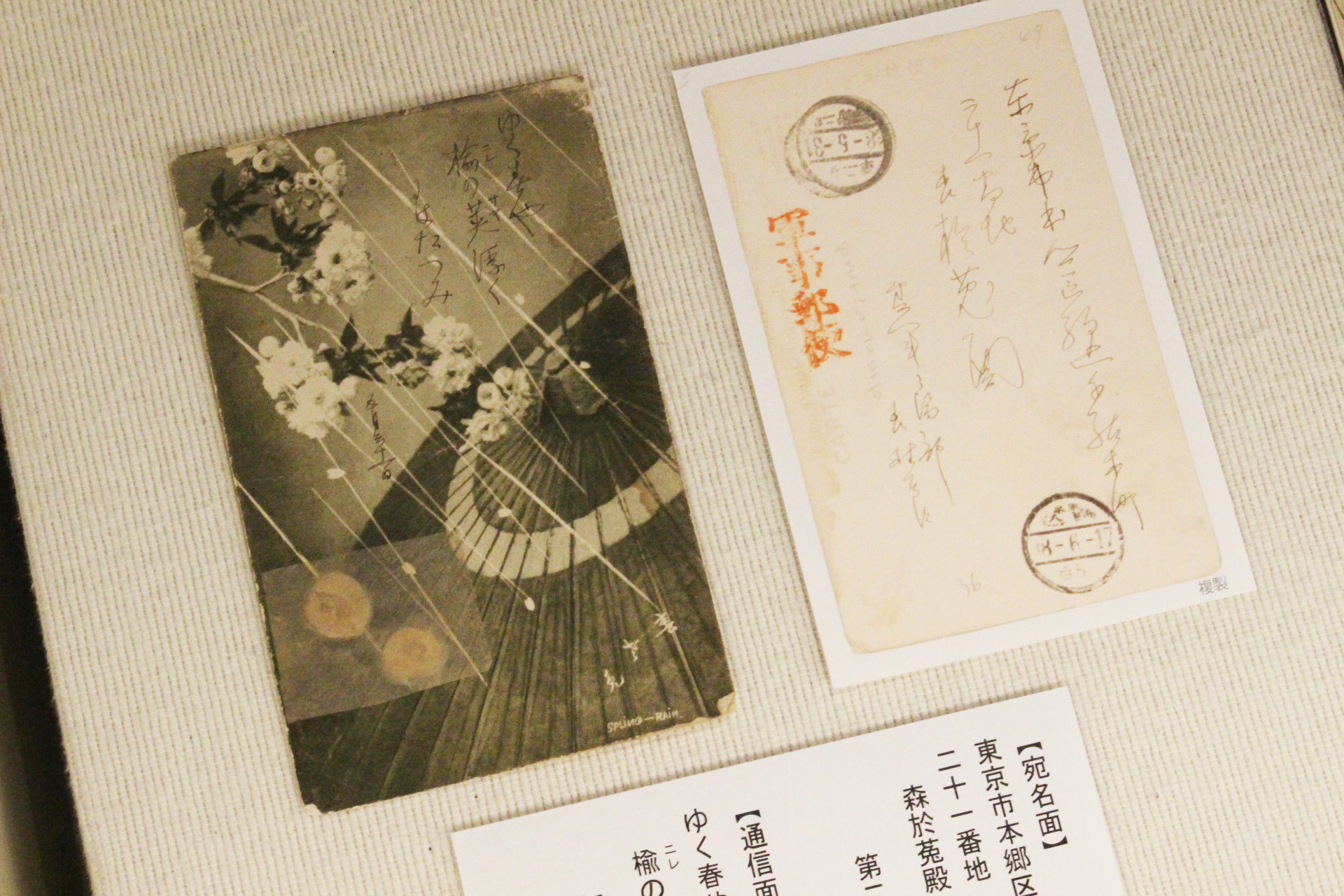於菟宛の葉書には、過ぎ去る春を詠んだ俳句の下に花びらのようなものが貼られています。日露戦争中、於菟は鴎外に未使用の絵葉書を送り、鴎外はその絵葉書に詩歌をしたためて返送しました(『父親としての森鴎外』)。この時、鴎外43歳、於菟15歳。長引く戦争で帰国もままならない鴎外にとって、大事な親子のコミュニケーションツールだったのでしょう。