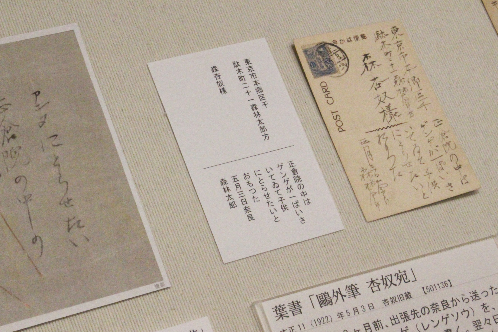 遺品資料の中には、鴎外の愛用品や自筆原稿、日記、書簡の他、親子の思い出が詰まった資料が数多くあります。鴎外は仕事で家族と離れる際はたびたび手紙を送っていました。本展では、日露戦争中に戦地から於菟に送った葉書と、奈良出張中に杏奴に送った葉書を展示しています。